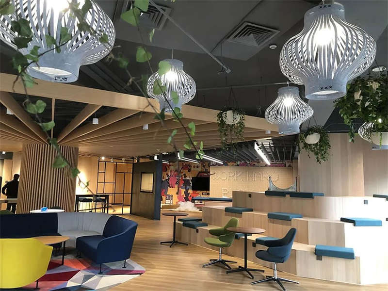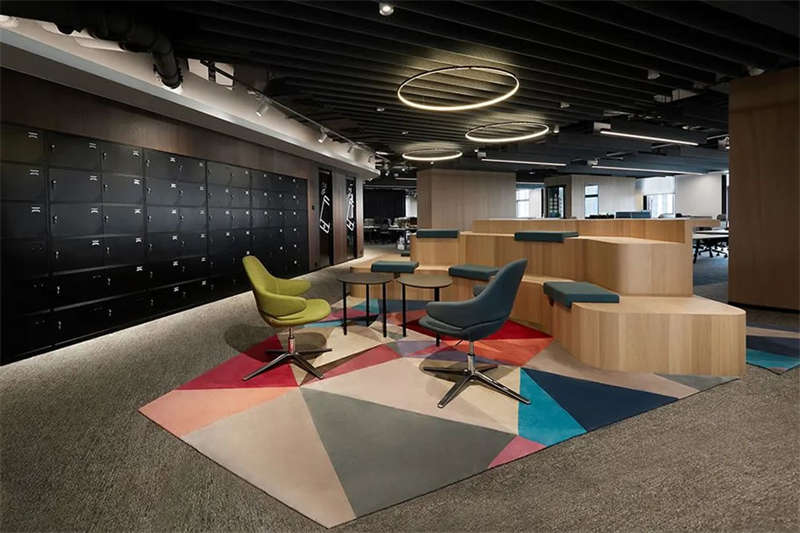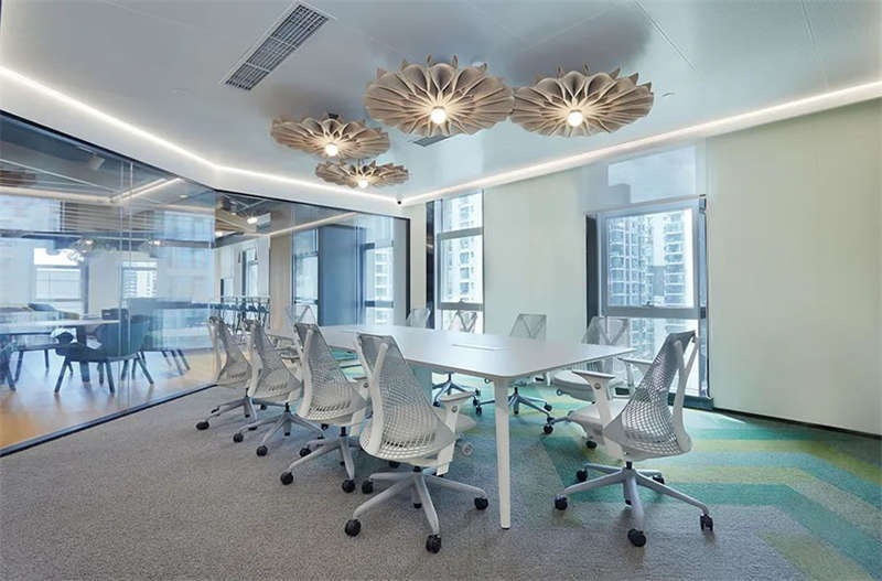 在空间规划设计上,进行了动静分区,并打破了原有的动线,路线上进行了延伸、切角设计。在规划各个功能空间中,充分考虑到建筑外光线与景观的因素,将最好的光线位置留作员工咖啡交流及健身区,将最好的视野区域作为总部接待大会议室。充分利用自然光,向员工传递正能量,其中亮点是每一个部门之间都设计了开放或半通透的多功能交流区域。让员工参与互动活动、讨论或组织公司活动,这种辅助办公空间充足的情况下,有助于缓解员工工作中的所有压力,帮助他们度过闲暇时光。