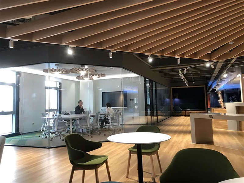 材料运用上,采用一系列天然、可再生和低排放的节能措施和材料,让员工感受到与自然的联系,同时提供了室内声学舒适度?;共捎昧斯久骋撞?mdash;—玻璃,各种玻璃的运用,充分体现了企业性质及对玻璃加工工艺的理解,既作为装饰材料,也让办公区各个区域都成了产品展示区,电梯厅和门厅运用了黑色背烤漆蒙砂玻璃,电梯厅顶部运用黑色银镜腐蚀雕刻形成总部办公地所在的区域地图,其他区域也充分将压花玻璃、幕墙玻璃、淋浴隔断玻璃及办公高隔玻璃等进行了充分展示。