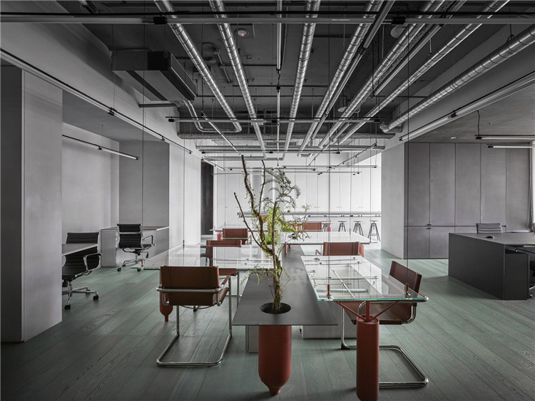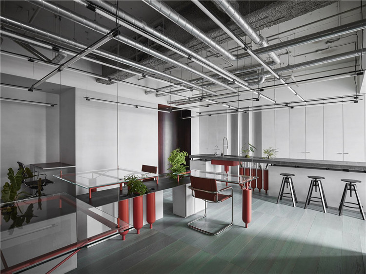 当灵感关键抓紧"科学"而非"办公室",设计师希望强化产业属性里的科学基底,扭转一般人对办公室的刻板蓝图.回归产品本身最贴近的实验室、工厂环境,日日可见的试管、生铁黑铁、气体输送管,以及包装承载科技气体的独特钢瓶,撷取生产链上再熟悉不过的材质与造型,拆解转换成办公空间的结构形体.