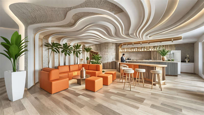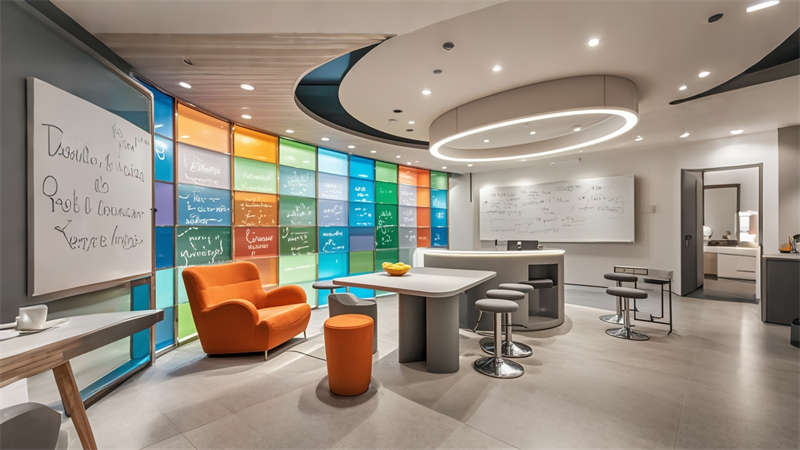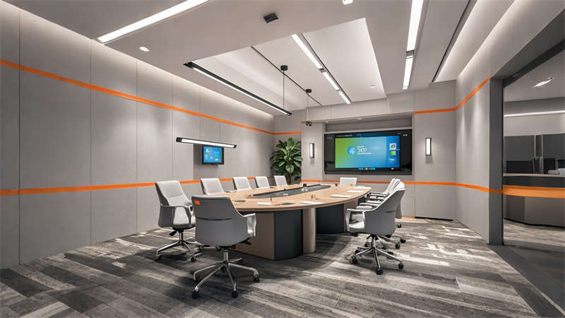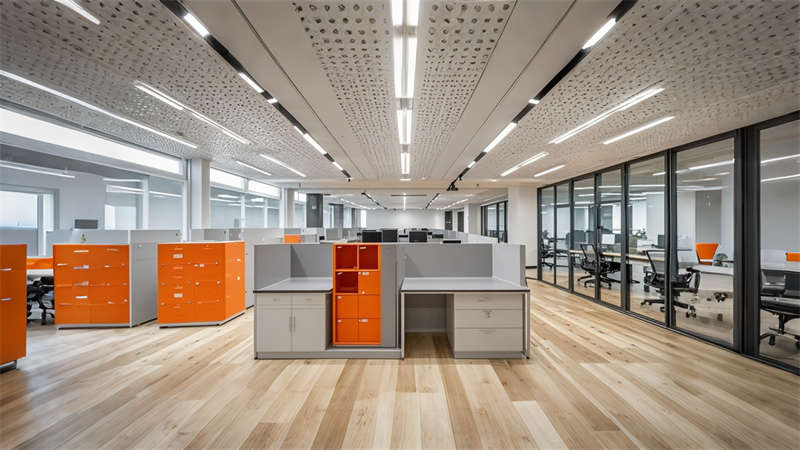 本项目为1800㎡现代简约风格办公室整体设计,以 ' 高效?活力?互联 ' 为核心设计理念??占涔婊捎枚卜智颍疤ü郴掖罄硎氤壬?logo 的碰撞凸显企业形象,开放办公区运用玻璃隔断保证采光与交流效率。色彩体系以企业标准色浅灰为主调,搭配活力橙点缀,木色中和冷峻感。材质选用环保型穿孔铝板、防滑地砖和 E0 级板材,集成智能会议系统和隐藏式线管设计。重点空间如高管办公室采用深胡桃木提升质感,休息区通过波浪吊顶和模块沙发营造轻松氛围。照明系统采用 4000K 色温 LED 线型灯带,搭配局部装饰吊灯,确保工作照度与空间美感平衡。全案贯彻人体工学设计,预留 20% 弹性空间适应未来发展需求。