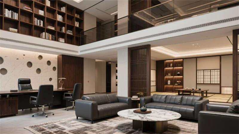 高管办公区通过灰玻与竖向木纹铝材构筑半私密空间,L型胡桃木办公桌与深棕真皮座椅彰显商务质感,独立阅读角的落地灯营造人文氛围。总裁办公室运用悬浮式书架墙与黑檀木办公桌塑造权威感,环形皮革沙发组与天然大理石茶几构成高端会客场景,日式茶室通过木格栅与洞石墙面实现东西方美学交融。