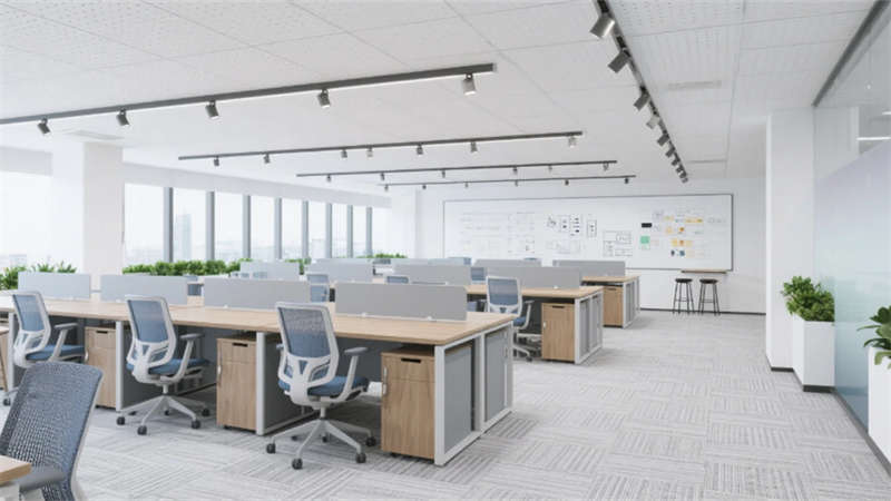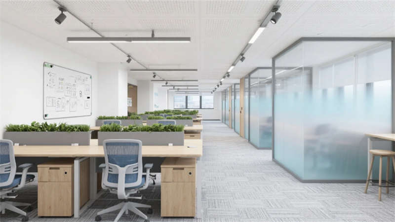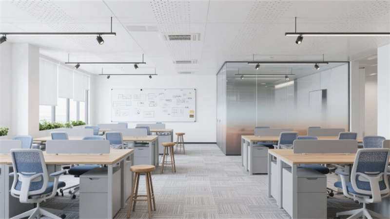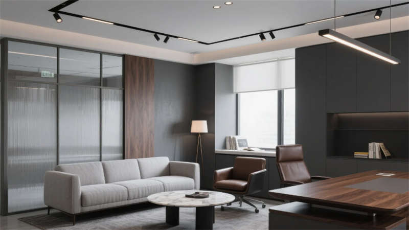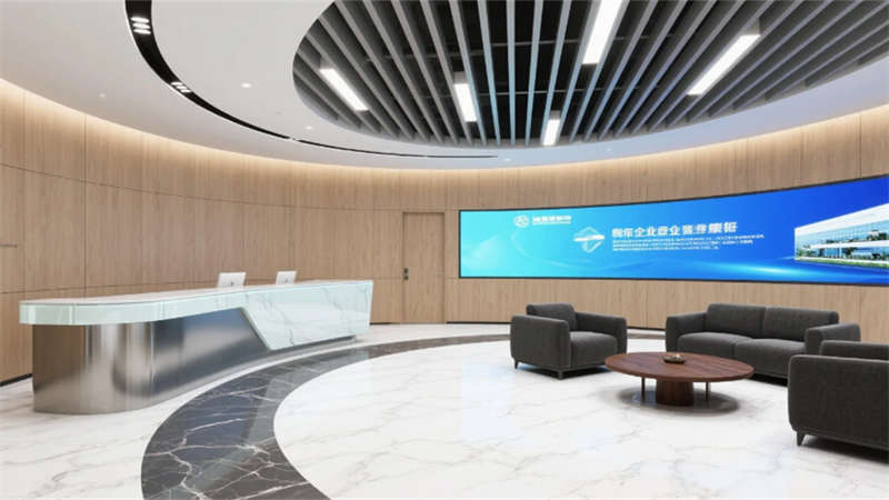 企业大堂延续外立面色系,雪花白大理石地面与深灰导视带构建空间骨架,曲面木纹石背景墙通过背光企业标识形成视觉焦点,渐变铝方通吊顶的线性光带引导人流走向??攀桨旃曰蚁鹉景旃?槲诵?,冲孔铝板吊顶整合轨道射灯系统,渐变雾化玻璃隔断内置绿植槽,编织纹地毯有效降低行走噪音。