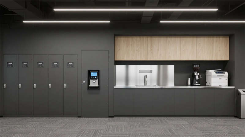 公共支持区以哑光不锈钢吧台为中枢,智能储物柜与嵌入式咖啡机满足高效办公需求。极简会议室采用深灰烤漆会议桌搭配磁性玻璃书写墙,环形反光灯槽确保无影会议环境。视频会议室通过U型布局与阵列麦克风优化远程协作,超窄边框屏幕墙与电动遮光帘实现智能会议场景切换。