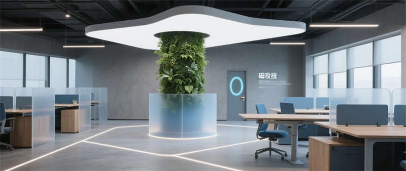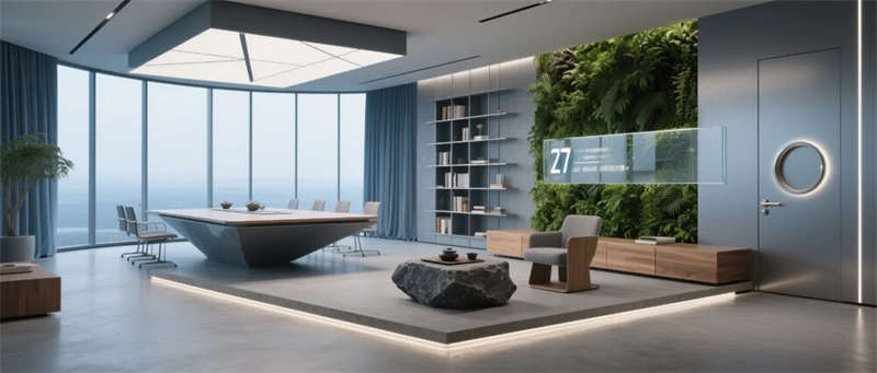 本项目以“未来生态办公”为核心理念,打造1200㎡科技与自然交融的创新型办公空间。设计采用哑光太空灰为主基调,通过雾霾蓝企业色与原木纹理的碰撞,在冷峻科技感中注入人文温度??占湟?strong>微水泥地面为基底,贯穿透光亚克力与阳极氧化铝材质,配合隐藏式线性灯带的流动光影,构建出具有呼吸感的数字美学场域。