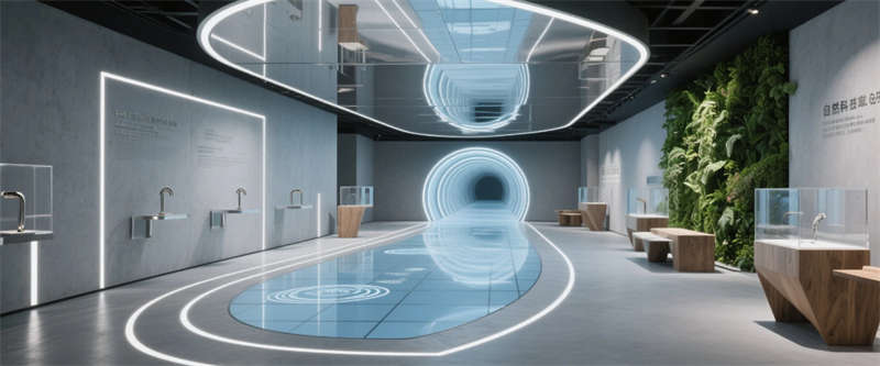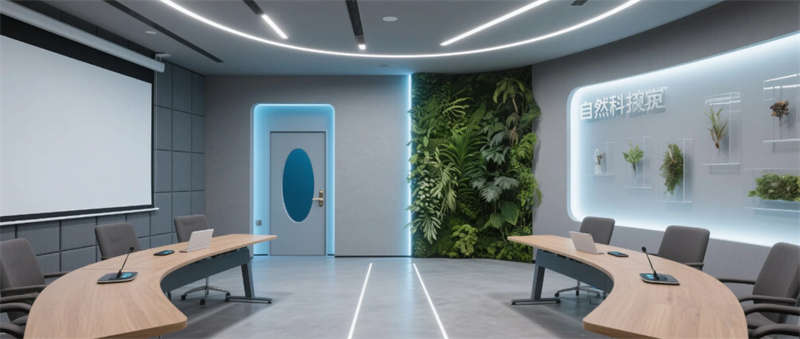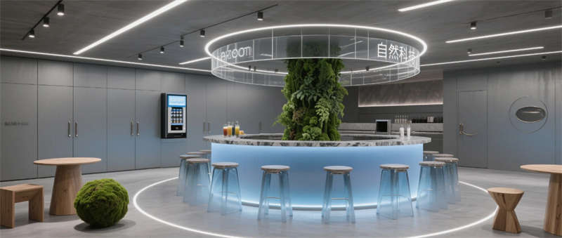 各区域通过四大统一性语言紧密串联:雾霾蓝椭圆金属门把手贯穿全空间,再生材料家具呼应可持续发展理念,声学墙面嵌入本地植物标本强化生态属性,智能灯光系统则通过4000K色温线性灯带实现昼夜场景的无缝切换。特别设计的全息投影展厅与智能阶梯会议室,通过LED交互地屏与AR悬浮展台,将品牌科技基因融入空间体验。