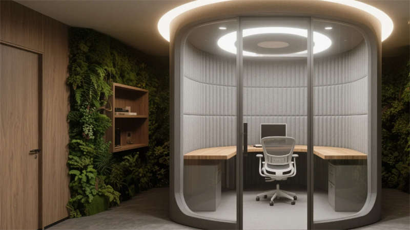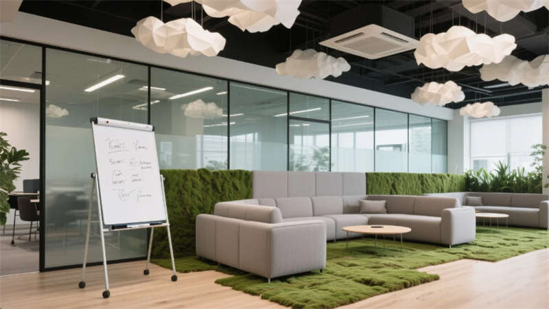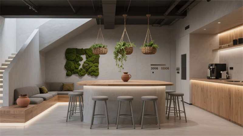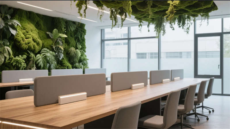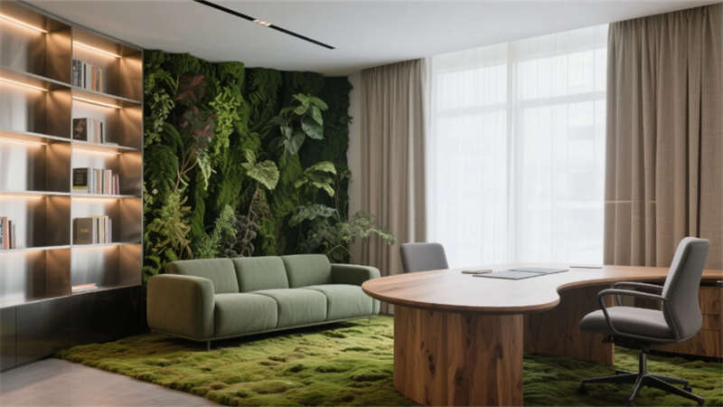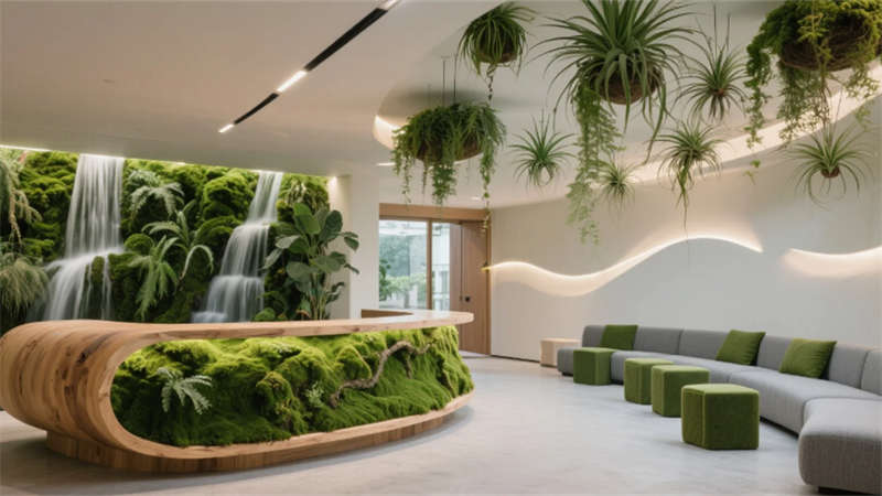 该设计以“自然共生”为脉络,将绿植生态系统与现代办公需求深度融合。入口处以苔藓艺术台与流水光墙奠定基调,流动的绿意从呼吸幕墙延伸至开放办公区,原木桌面在漫射天光中模糊室内外界限。独立办公室的垂直森林墙与静音舱的苔藓隔断,在私密空间延续生态语言。