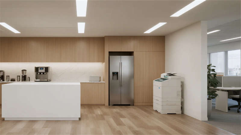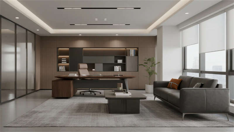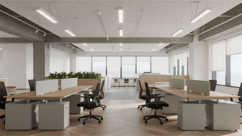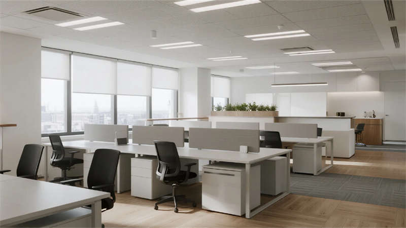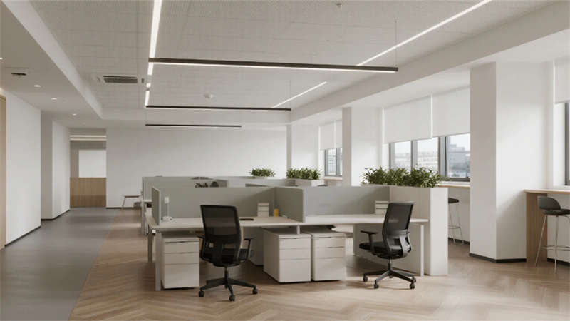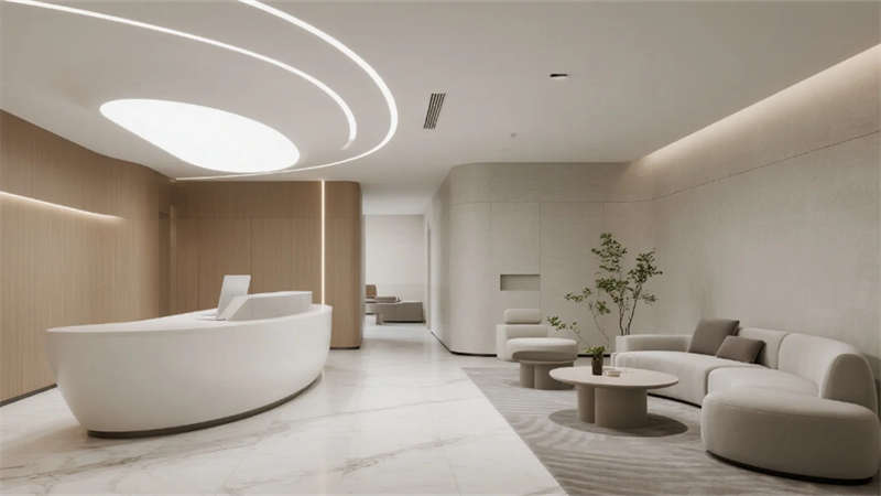 内部空间延续外部的纯净气质。企业大堂以浅白色大理石地面与温润木纹墙面奠定基调,弧形纯白前台点缀深蓝企业标识,悬浮线性灯光延伸视觉。右侧等候区??榛撤⒂肼讨才杈坝焓媸史瘴?,左侧数字影像墙动态展示企业风采,浅灰肌理漆背景墙在隐藏灯带映衬下更显质感??攀桨旃康鞲咝в肓榛睿咨┛孜籼旎ㄏ?,浅灰可升降桌与黑色人体工学椅组合排列,协作岛与窗边高吧台满足多元需求,浅木纹PVC地面增添自然暖意。高管办公室运用灰玻隔断与电动雾化膜保障私密,胡桃木办公桌、深灰皮质沙发与嵌入式书柜彰显沉稳,无主灯设计营造专注氛围。公共支持区??榛商?、浅木纹储物柜与智能文件柜集成高效服务,细节处的绿植点缀延续生态关怀。整体设计从外至内,以统一的色调、考究的材质与智能化细节,塑造出体现合肥创新精神的智慧办公新标杆。