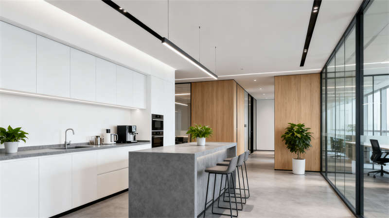 外观设计采用简洁的线条与通透的玻璃材质,既保证了建筑的现代感,又能让自然光充分进入室内,同时融入局部的金属元素,提升整体的精致度。室内空间规划注重功能性与舒适度的平衡,开放办公区采用灵活的布局,方便员工之间的交流协作,家具选择线条流畅、质感轻盈的款式,减少空间的压抑感。?