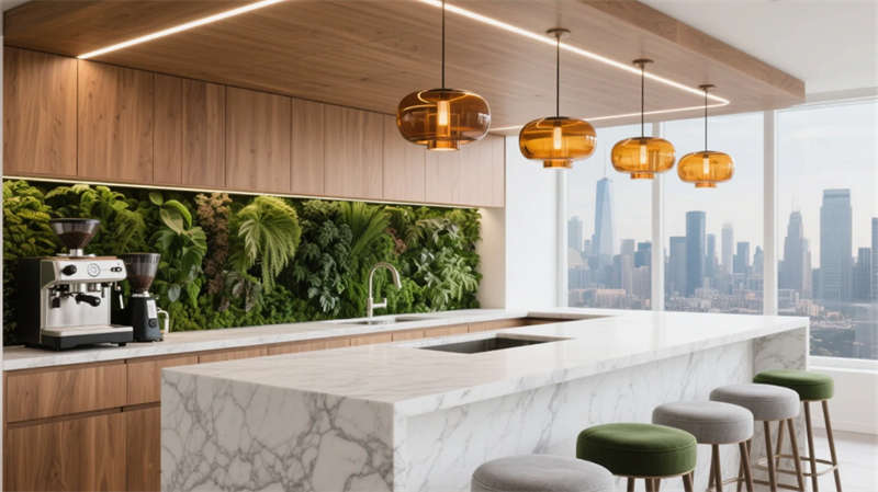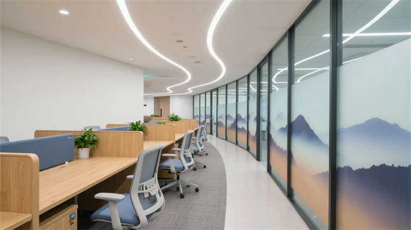 阶梯式沙龙区打破传统会议格局,弧形看台激发平等交流,全息投影让思维可视生长。茶水间垂直花园与咖啡香气交织,成为非正式碰撞火花的土壤。独立办公区低隔断设计延续视野通透,曲线灯带如枝蔓延伸,提示着人与空间的有机联结。