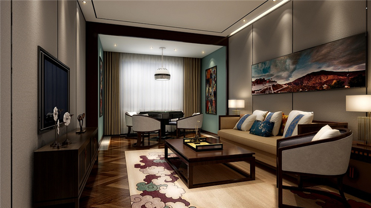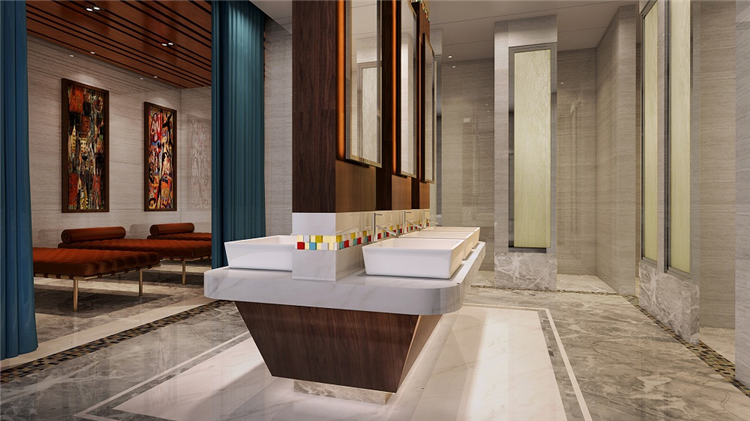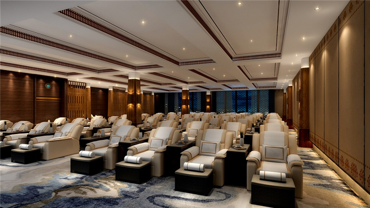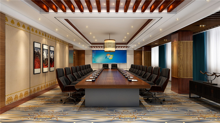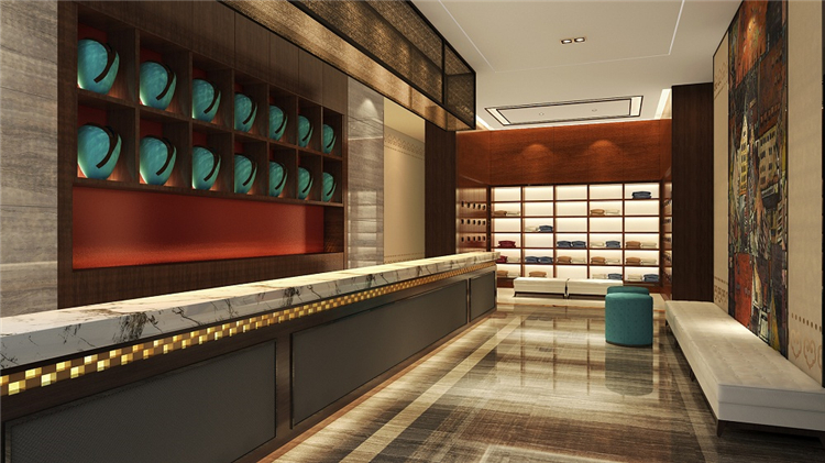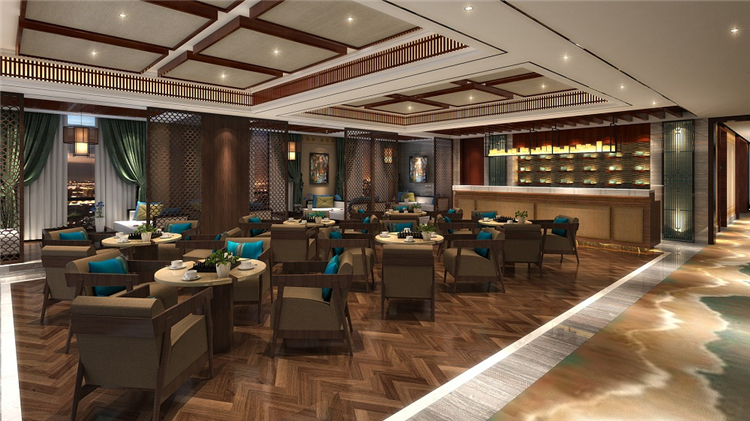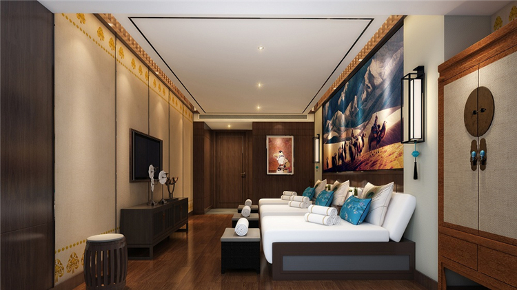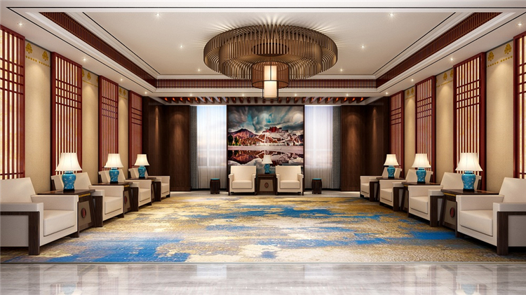 设计师同时考虑到地域民族文化和功能实用性,结合现代简约与传统藏式风格,为往来的游客提供一个放松休憩的完美场所。设计师主要运用藏蓝、金黄、喇嘛红等浓重色彩进行搭配,灵感既来自于藏族传统文化及宗教艺术,也来自于雪域高原山高天蓝水长花艳的自然景观。借用柱网结构、几何纹路、吉祥花等藏式建筑形式和图案进行装饰和点缀,但将繁复的式样尽量精简平面化,取其古朴、神奇、粗犷的神韵,表达一种平衡、对比、和谐统一的构图规律和审美思想。