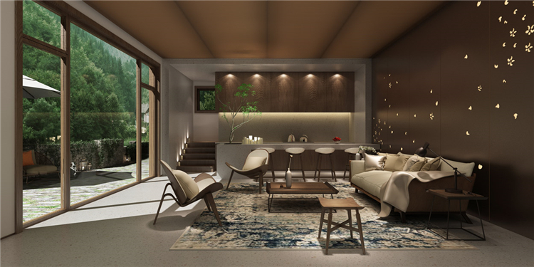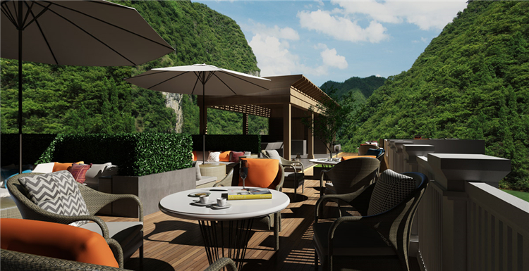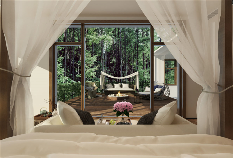 本案度假酒店设计依山傍水,设计师在规划时,充分考虑到自然环境带给酒店的附加值。设计方案时,设计师就将部分功能区规划到室外露天场地,当然在室内设计中也充分利用了自然采光的设计手法,让整个度假酒店与自然环境融为一体。