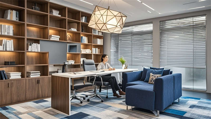 办公区采用模块化布局,配置智能升降桌和人体工学椅,裸顶喷灰工艺结合轨道灯系统实现灵活照明。色彩体系以高级灰为基底,搭配原木色系缓解视觉压力,局部采用深蓝跳色增强空间层次。材质运用注重环保性能,墙面大量使用穿孔吸音铝板,地面采用防滑地胶与静音地毯组合。
