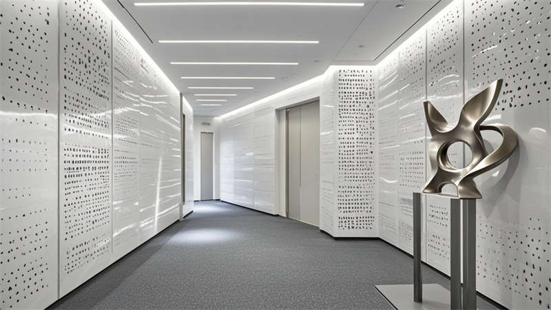 智能系统集成包括电动百叶帘、会议预约系统、环境监测显示屏等科技元素,茶水间与休息区特别设置空气净化绿植墙。灯光设计采用3000K-4000K色温可调系统,走廊采用线性引导光带提升导向性。