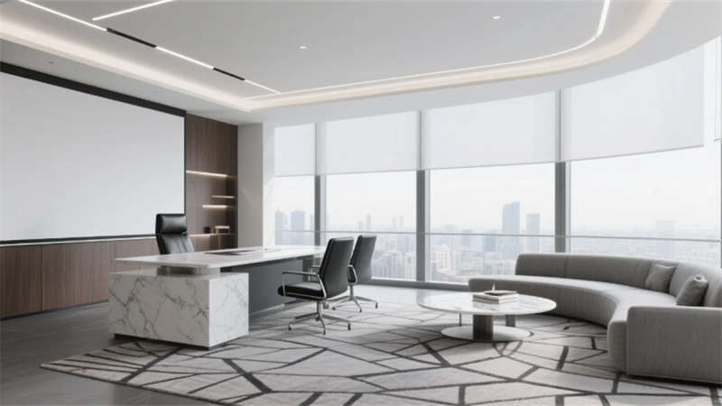 全案贯穿哑光金属、木饰面与大理石材质细节,4000K中性光统一色温,智能灯光系统提升能效。设计通过严谨的线条分割与人性化功能分区,实现美学与实用性的深度融合,重新定义现代办公空间的品质标准。