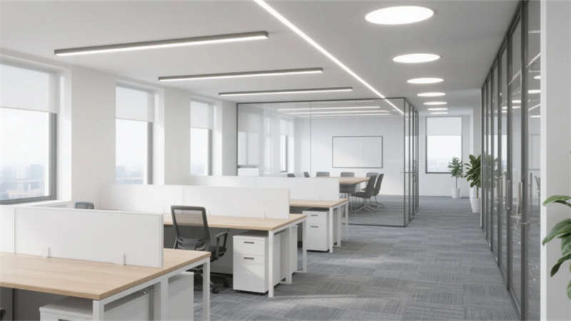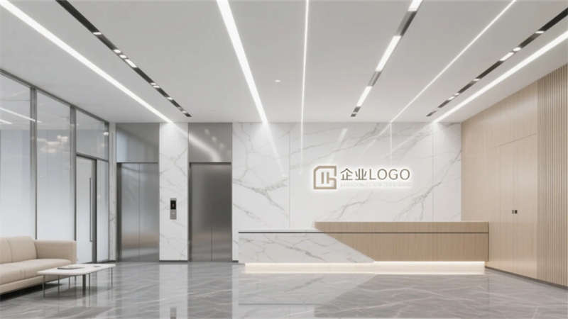 外立面采用横向分割的玻璃幕墙与浅灰金属框架,悬挑雨棚与隐藏式灯带强化几何美学,夜晚呈现轻盈通透的视觉印象。大堂以白色石材与浅木前台奠定简约基调,线性灯带引导动线,绿植墙与玻璃隔断休息区平衡商务与休闲氛围。办公区通过白色工位隔断与浅木桌面实现高效布局,线性灯光与落地窗引入充沛自然光,玻璃会议室保障通透视野。