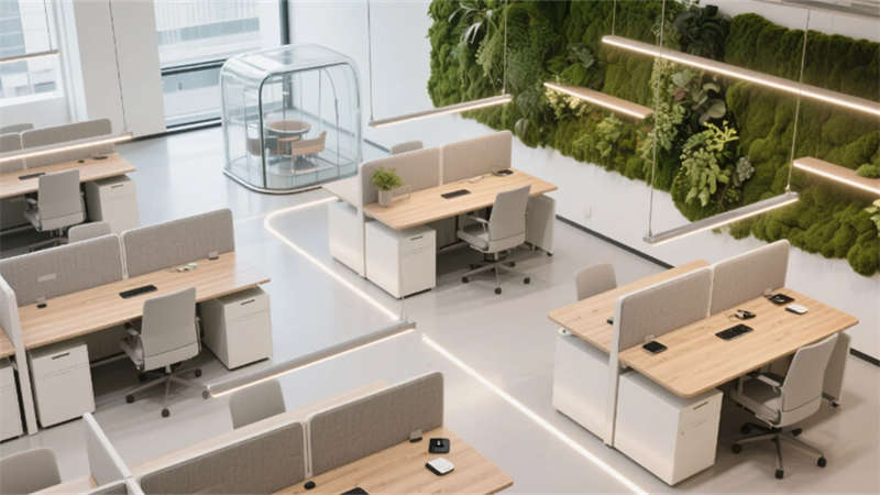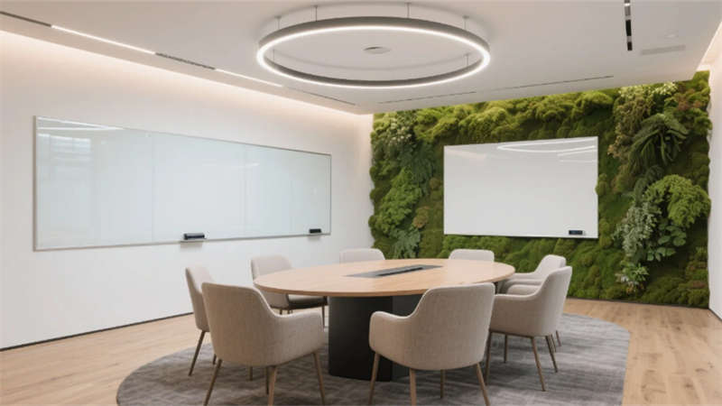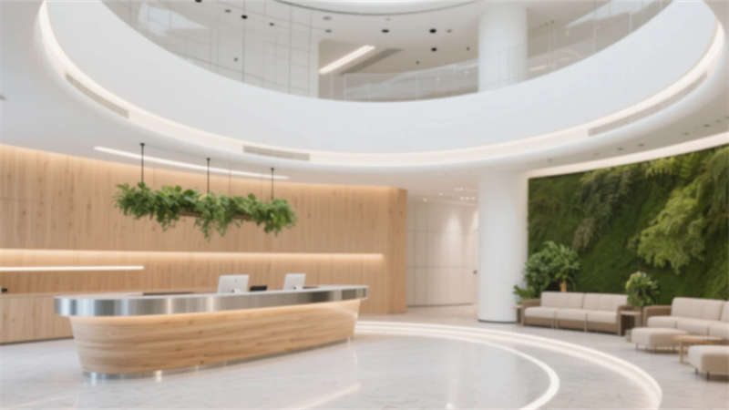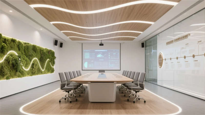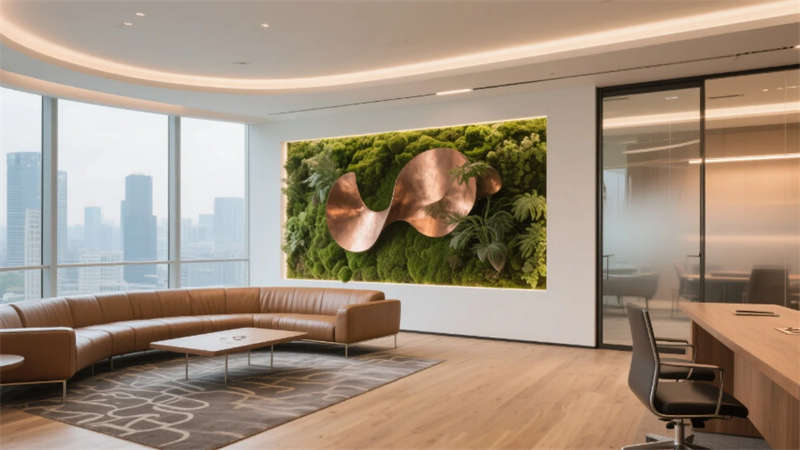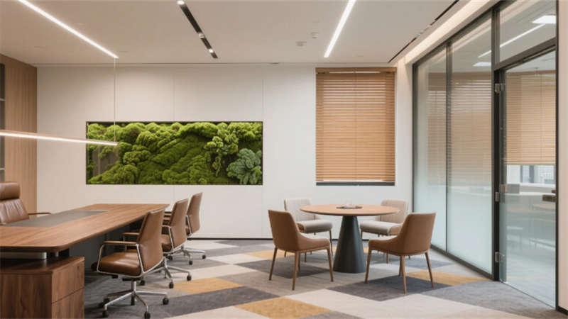 生态科技体系覆盖全场景:经理办公室苔藓墙集成空气监测系统,总裁室雾化玻璃联动光伏发电,小会议室绿植墙搭载微滴灌节水装置。材质选用安徽本土元素升级再造,大厅水磨石掺入大别山矿石粉,定制地毯纹样提取徽派窗棂数字化变体。