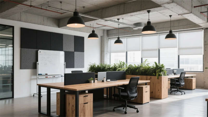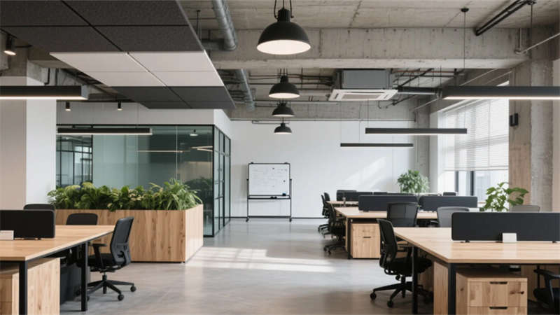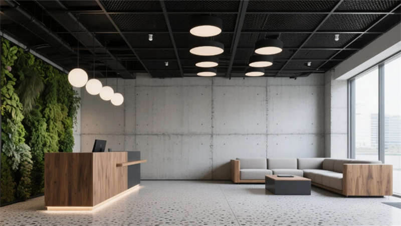 步入大堂,粗犷的混凝土墙面与水磨石地面形成质感对话,悬浮金属网天花下,原木前台与背光绿植墙晕染出温润生命力??攀桨旃有ひ祷?,模块化橡木桌搭配黑色钢架,绿植隔断巧妙划分空间,自然光穿过智能遮阳帘,在混凝土天花上投下流动的光影诗行。