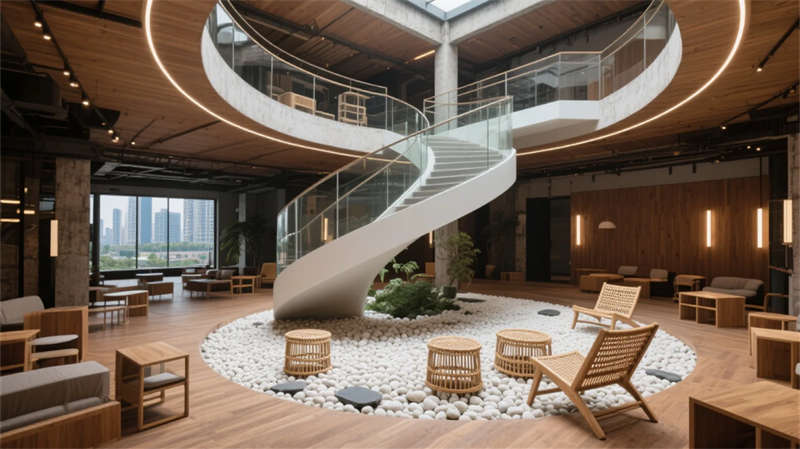 开放式核心区采用??榛揖呦低常浜现悄苷彰饔肷в呕?,兼顾协作效率与专注需求;阶梯沙龙与透明会议盒子激发即兴创新,可移动隔断实现场景自由切换。最具特色的是贯穿三层的垂直生态中庭,旋转楼梯缠绕常绿藤蔓,成为连接空间的活力纽带。