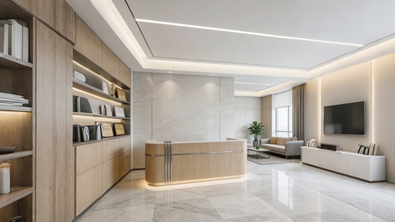 本次办公楼效果图聚焦核心公共区域,以现代简约风格为主,兼顾商务质感与实用功能。电梯厅整体采用通透化设计,墙面选用浅灰色哑光石材铺贴,纹理细腻且耐脏易打理,搭配金属线条勾勒轮廓,提升空间层次感。电梯门采用窄边钢化玻璃材质,搭配隐藏式把手,简约大气且符合现代办公审美,门体嵌入柔和感应灯光,兼顾实用性与氛围感。墙体设计注重留白与光影结合,局部点缀浅色系装饰面板,打破单调的同时不破坏整体商务调性。地面铺设防滑耐磨地砖,色泽与墙面呼应,整体空间采光充足,光线柔和不刺眼,既满足办公空间的庄重感,又营造出舒适、高效的通行体验,完美适配中高端办公楼的定位,凸显简约而不简单的设计理念。