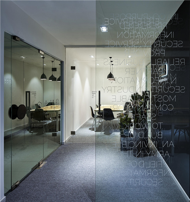 业主希望突出公司的科技感,主要就以黑白为主,玻璃上的装饰采用正反拼贴,营造出慢慢消印的代码的科技感。为了节省造价,空间使用常规建材乳胶漆、地毯、地平漆。