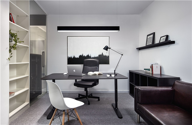在78平空间内布置20个工位、茶水间、会议室和一个独立办公室并不容易,设计师在平面功能最大化,营造丰富的灰空间,消除办公空间以往严肃紧张的固有印象。黑白极简的设计语言在节省造价的同时完美契合了IT公司的现代感与科技感,而木质的飘窗是整个黑白空间的一抹暖色,在有限的面积中为员工营造了轻松的阅读与交流空间。丰富的玻璃隔断形成通透的空间,相互贯穿,模糊了空间属性,从而削弱小空间带来的局促感。