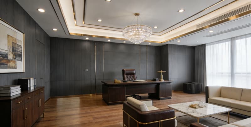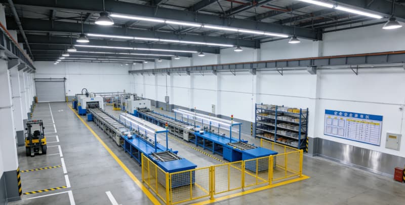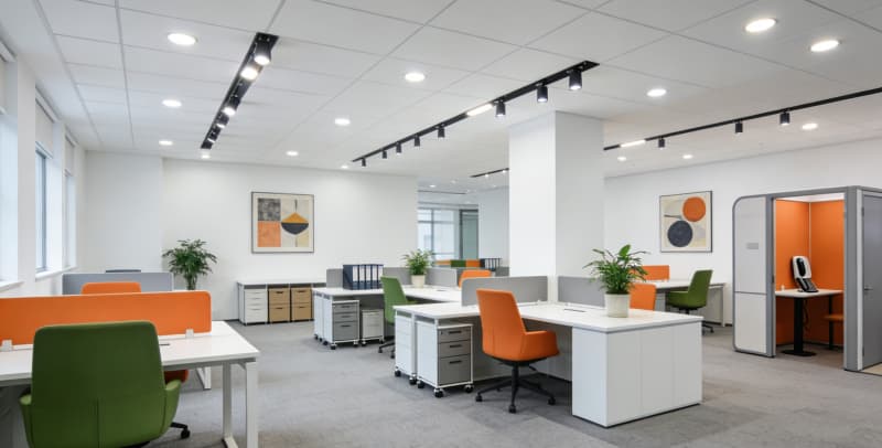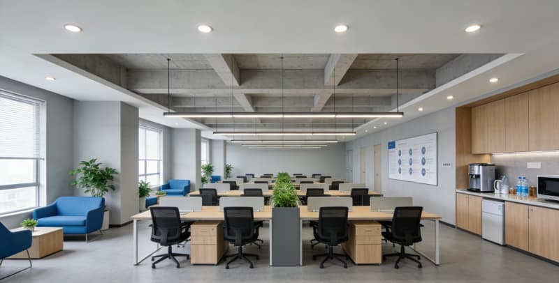 本厂房设计以“实用与美学共生,工业与现代交融”为核心,针对亳州企业生产与办公需求,打造4500㎡多功能复合型空间。外观采用深灰氟碳喷涂铝板搭配Low-E玻璃幕墙,以橙色线条点缀,12米通高玻璃入口与金属发光LOGO彰显大气,太阳能光伏板融入屋顶设计,兼顾质感与环保。生产区域按需分区,车间1以金刚砂地坪与裸顶设计适配重型生产,车间2采用洁净彩钢板与环氧树脂地坪,满足无尘标准。办公区多元适配,涵盖简约行列式、灵动岛型及极简独立工位,搭配PVC地板、地毯等材质,以浅灰、原木色为基,点缀鲜活色彩?;嵋槭矣胱懿冒旃以蛲ü臼蚊姘?、实木地板等材质,分别营造专业与轻奢氛围。整体设计平衡工业质感与现代舒适,明确功能分区,适配企业高效生产与办公需求。