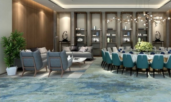 主体的圆形餐桌上悬挂的是一盏仿生吊灯,随枝干散发开去的白色灯盏犹如悄然开放的花朵,为整个空间提供一种温馨而典雅的就餐环境。同时,在餐桌椅上大胆地使用了青蓝色,熟悉中国画的人也许一眼就看出了设计的用意:青蓝是国画中较为常见的一种大面积使用的色块,更常见于山水画当中。