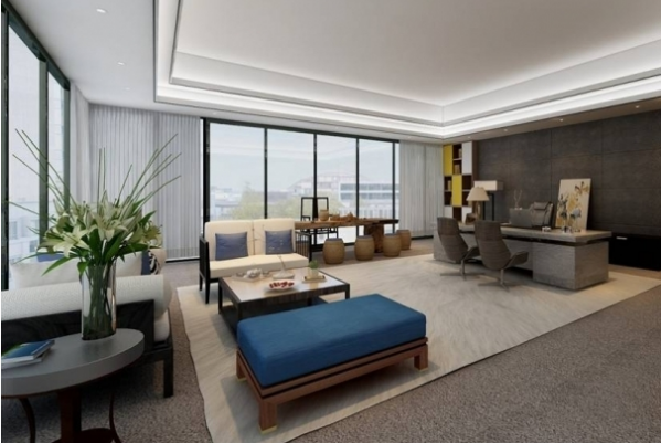 总经理办公室采用落地窗的形式将空间在视觉上向外扩展,同时增加视野的广度,在工作间隙中观赏一番自然之景,疲劳尽可除去。为了缓解公办空间弥漫的焦虑感,在整体布局上,设计师更多地朝着简约靠拢,但绝不仅仅只是如此,在这个空间中,我们可以看到装修风格的多重交叉,局部呈现出简约的风格,但该有的一个都不会少: 大沙发群、小品茶区、主体办公桌、书架及展示柜等。
