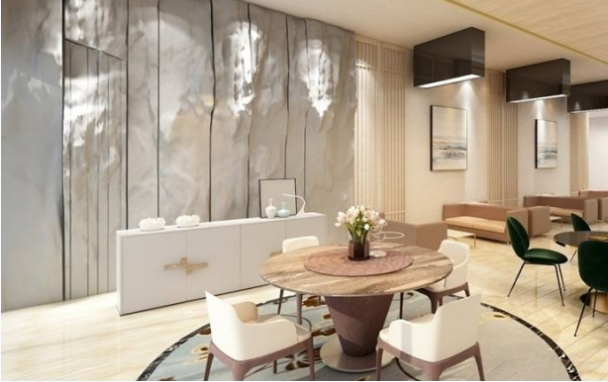 仔细观察,我们能够发现接待区设置了三种不同的桌椅模式,这样可以满足不同数量的访客对于等待时间的安排需求,从细节处体现一种企业的人性化关怀。总的来说,接待区呈现出轻奢而不致声色喧哗的独特氛围。