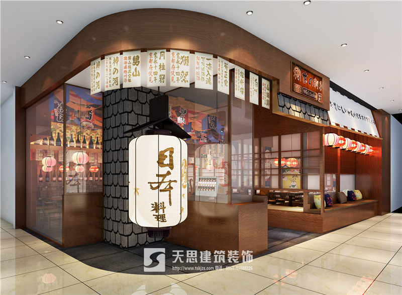 体现浓郁的日本民族特色,除了保持日式料理店的传统风格外,还可增添一些现代的时尚符号,比如针对日式中常见的木质材料,可以将不同颜色质感的木头相融合,配合砂岩、金刚板、青石等比较刚毅的元素,刚柔并济的视觉效果定能带来幽雅舒适的就餐环境。