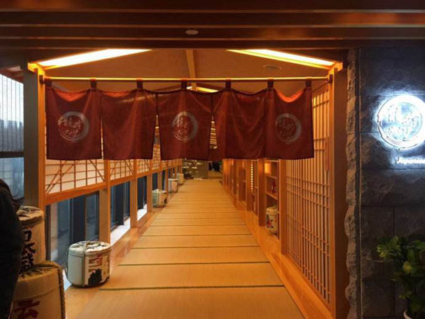 通常是门口有一个3段式,或者是4段式的暖帘,写上自己的店名,中文日文,或者是其他,然后通向厨房的门口挂上一个暖帘。