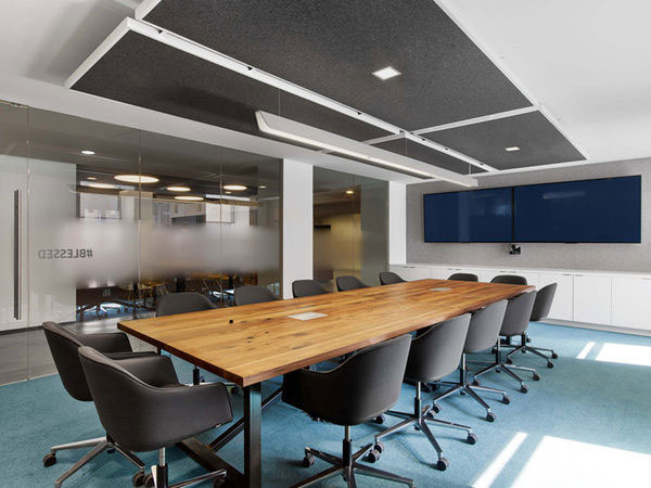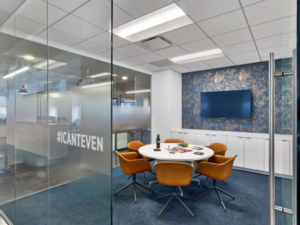 清朗凝练的空间更多了一份雍容典雅的都市气质,依旧以蓝色标志色为装饰主调,只是这次的蓝色更暗雅、更富于细腻的变化。极富质感的白蜡木材质与黑色碳钢构件制作的家具,呈现出特有的都市气质。闭合的洽谈室和会议室大多聚集于空间的内部,以尽可能留出沿窗的空间令视线不被遮挡。连续而开敞的玻璃窗,让室外城市美景尽收眼底,心情也变得豁然开朗。
