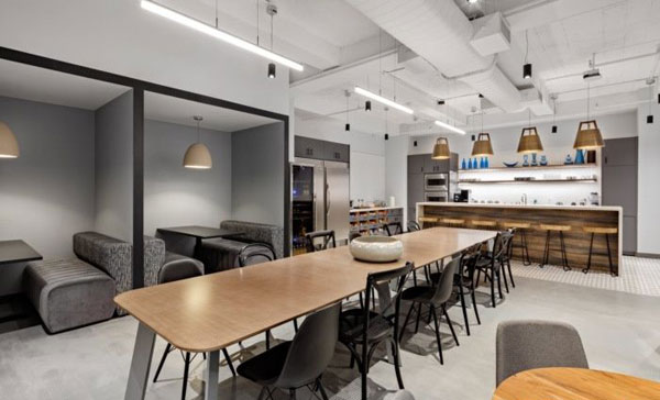大型咖啡馆和食品储藏室是为协作而设计的,是办公室的公共中心。一张长长的餐桌、展位、座位和休息区为非正式会议、社交聚会的地方。