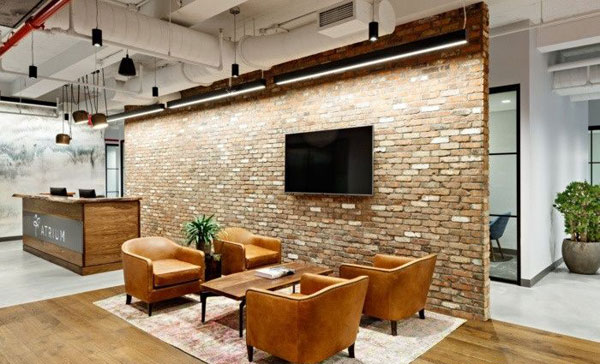 一个裸露的砖墙和水彩墙覆盖,提供了一种温暖的感觉。靠近接待处的是一个咖啡吧和休息室,它通向一个大型会议室。