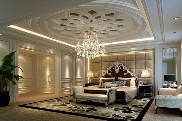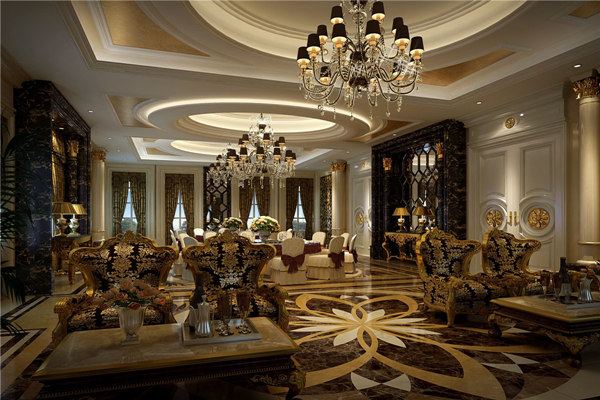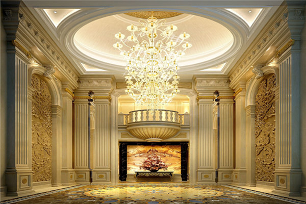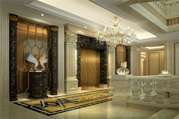 走廊依然是延用水晶灯和罗马柱,但在装饰上则搭配金属雕塑,华丽的外表下透漏着高贵霸气。