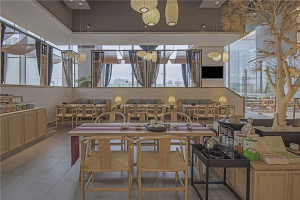 茶艺馆的空间设计要与其总体设计风格相匹配。在空间布置上可通过虚的手法遮挡视线,似隔非隔,隔中有透,实中有虚。例如利用布慢、漏墙、珠帘、屏风、竹篱、木栅等缓冲通道与视线;又如,利用通道的回绕曲折相通,转身回眸处别有一方天地。适当的分隔还可满足部分客人不想被打扰的心理,这就是所谓的"园必隔"。