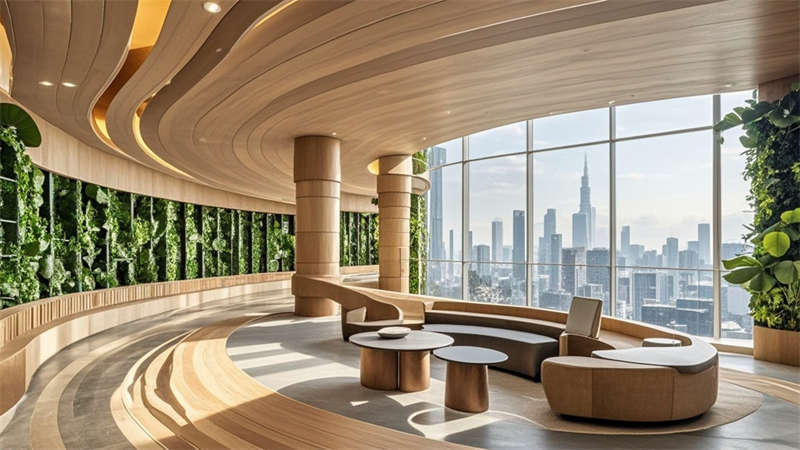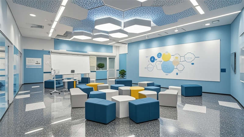 本1500㎡现代简约办公室设计以'高效协作·人文关怀'为核心,采用模块化空间布局提升使用弹性。主色调选用浅灰、白、木三色系,局部点缀企业深蓝色强化品牌认知??攀桨旃捎?.2m×1.8m标准工位???,通过玻璃隔断实现90%自然光渗透率。智能照明系统根据日照强度自动调节色温,全年节电率达35%。核心筒改造区运用曲面木饰面弱化建筑结构,形成自然交流节点。声学设计方面,蜂窝吸音板(NRC 0.85)与隔音舱(STC 52)组合控制噪音污染。茶水区采用磁吸轨道插座系统,支持设备灵活接入。所有家具均符合WELL建筑标准,办公椅配备6向调节功能。通过BIM技术实现管线综合,保留3.2米净高营造开阔感。