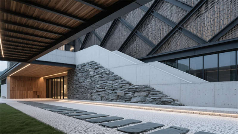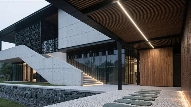 建筑外观以滁州竹海为灵感,斜交网格结构勾勒出山势轮廓,穿孔铝板在光影间呼吸。悬浮橡木雨棚如云中栈桥,将自然意象引入现代语境。青石板基座延伸至室内,形成连贯的在地叙事。