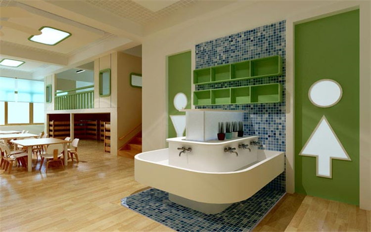 洗手区域的设计:此处通往的是就餐区,在洗手池的设计上,设计师对地面、洗手池都做了处理,目的就是为了避免因为水造成的地面湿滑,两个门一个进一个出,设计是希望可以从小培养孩子排队的意识,一进一出之间也见证了教育的重要性。