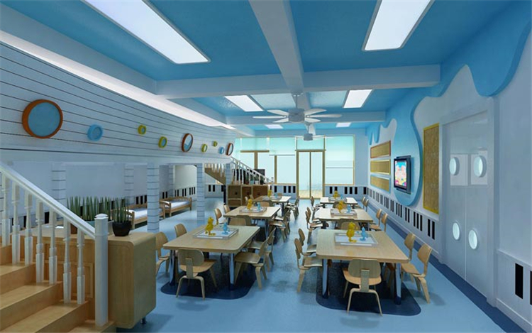 就餐区的设计:在这里孩子们将会享受到美味的佳肴,一个班级的孩子们坐在一起用餐,可以培养彼此之间的默契,在就餐结束之后,孩子们可以帮忙收拾餐具,这是要培养孩子动手的能力,在一切都结束之后,孩子们可以坐在一起看自己喜欢的动画片。