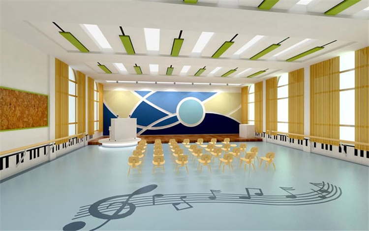 表演区域的设计:这是最后一个音乐教室,但是这个教室在属性上与前两个稍有不同,在满足音乐教室的同时,也满足表演的需求,设计师希望每一个孩子都是一个表演家,在台上可以尽情的表演,培养每一个孩子表演、演讲的能力。