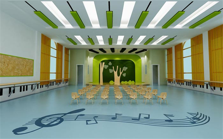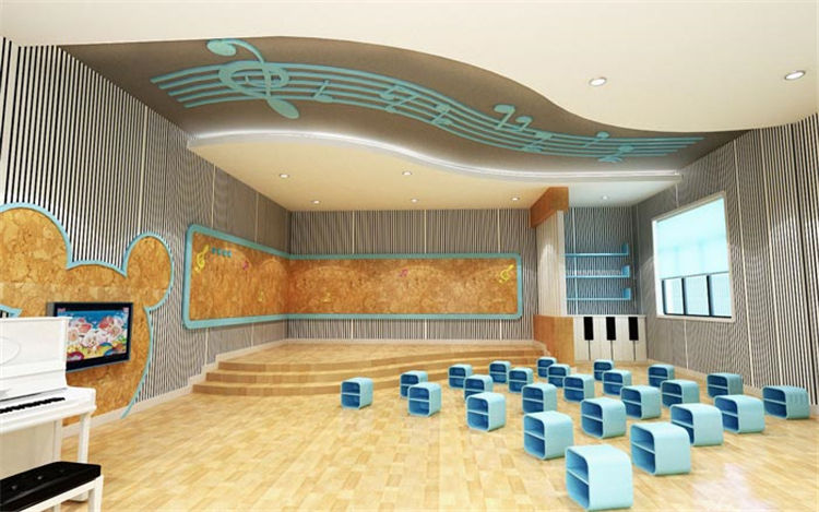 音乐教室的设计:这里大致可以容纳下30多个小朋友,也就是大概一个班多一点点,能歌善舞是每个家长对于孩子的特殊期望,对于孩子本身来说也是一个不可不得的技能,在设计师看来若是引导得当,让孩子喜欢唱歌、跳舞也不失为一件功德无量的事情。