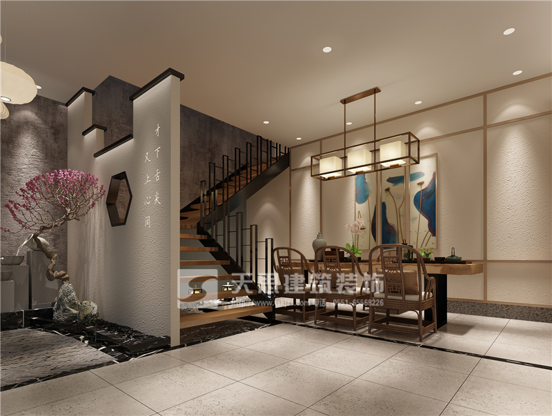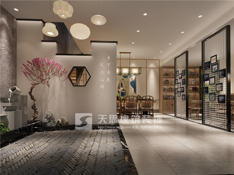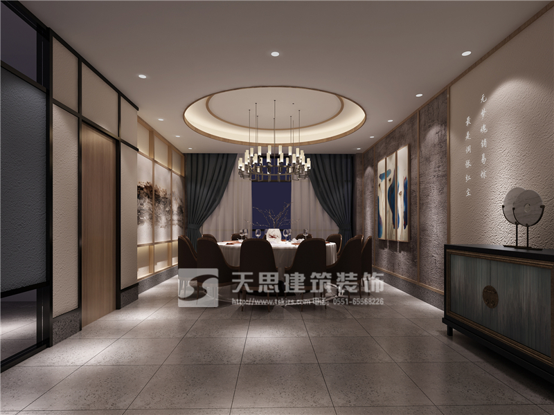 圆柱吊灯、墙壁刻字、墙壁上的国画、餐具的摆放,一切的一切相互融合起来,形成一个优质的就餐环境,在这里让客户感受到不一样的就餐氛围。