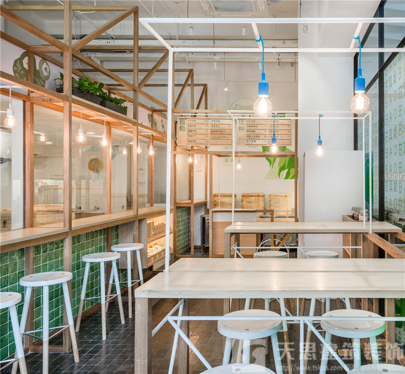 在室内空间结构上,我们倾注了大量巧思。玻璃间是包点制作区,制作人员在玻璃间内完成擀面、包馅和蒸制等一系列工序。玻璃间外的上部空间由木质框架勾勒,以墙上的品牌标志为背景,摆放着盆盆绿植,枝条垂坠而下,清新可人??占湎虏考尤肓说醯坪妥唬环矫媸沟谜褰峁垢暾?,另一方面便于食客观察了解制作过程。玻璃间上部兼具玻璃与木头两种质感,下部的墙体由手工抛光的绿色瓷砖铺就。店外,玻璃间的一面正对街头,外延的木质搁板既为顾客提供便利,也使得店铺内外更为浑然一体。