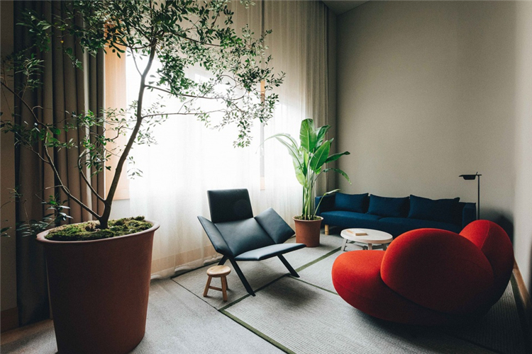 此酒店设计在进行内部改造时,尽力尊重了建筑物的原始特征。因此,建筑地板扩建时采用了与原建筑相同的混凝土材料加以打磨,雪松木和日本灰泥等传统材料的使用也是为了保留建筑过去的痕迹,营造出岁月感。此外,以“aimai”为设计理念,设计师在酒店的一系列空间中创造出“无形”的氛围,通过模糊不同空间的边界,使空间成为能够适应不同变化的多功能区域。这个理念在接待处等公共空间得到了最好的体现,接待处逐渐延伸进酒吧及餐厅,因而兼具咖啡吧的功能。这样的混合空间,得益于酒店将所有空间及功能交互融合的愿景。