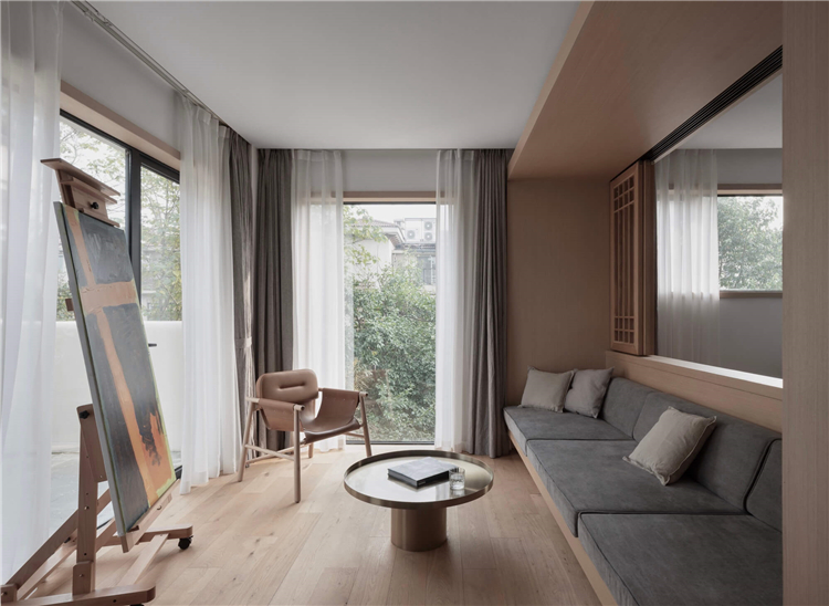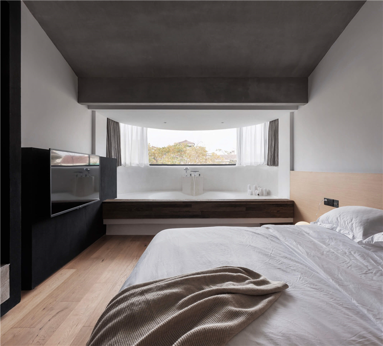 设计师针对民宿的入住功能一共设计了八间不同布置风格的客房,将入住功能布置与二三四层,重新规划房间平面,扩大每一个房间的卫生间,增加落地窗,以此增加舒适度,同时为入住的客人创造趣味性的体验。在每一层中间以中岛作为过渡,对应每一个房间,即协调客房的动线关系,又给每一位入客人提供便捷的交流空间。