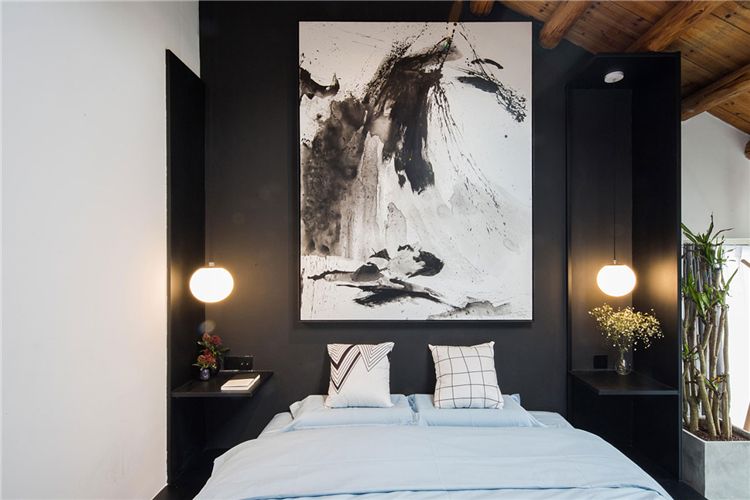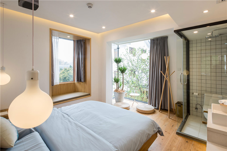 设计采用了未经加工的天然褐色原木及灰色砌砖来营造温馨怡人的原始氛围,安静、私密和精致。酒店整体现代禅意简约风格设计,深色的主基调,本土粗犷肌理的石材、手工质感的漆面、黑色系的木头、适度的钢架结构、全实木的家具,配合棉麻的窗帘、羊毛的地毯、密织埃及棉的床上用品,冷峻和温暖的相辅相成,成为一个溪流边休养生息的家,隔绝繁杂城市生活的安静避风港。