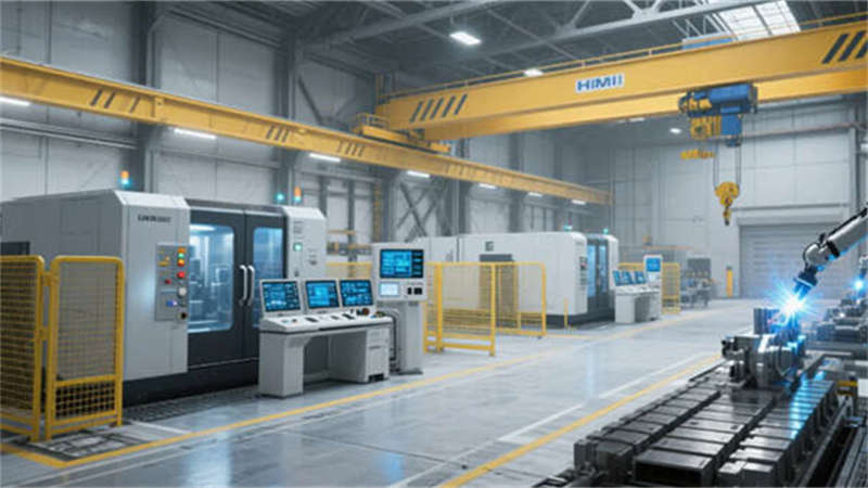 核心生产区以灰调环氧树脂地坪为基底,大型CNC加工中心与智能机械臂组成“U”型产线,顶部集成黄色安全标识的桥式起重机轨道,配合蓝光焊接机器人动态光轨,形成极具未来感的工业图景。办公区突破传统厂房设计,通过混凝土肌理墙面、悬浮式玻璃会议舱及企业色声学??椋菇呕チ闹腔酃芾碇惺?。