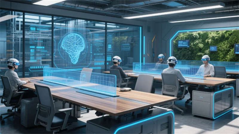 生态基因贯穿每个细节:光伏连廊的遮阳发电结构随日照角度变幻肌理,雨水回收装置化作中庭的液态雕塑,木纹铝材桌面流淌着实时产能数据。智慧会议室的声学穹顶折射出数据暴雨,玻璃幕墙在沙漠与极地场景间瞬时切换,腕表投影界面与全息沙盘构成决策中枢。