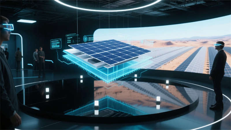 技术展厅打破虚实界限,光伏组件剖面的微光粒子在AR交互中跃动,沙漠电站的全息投影与真实光照系统共舞。研发中心的螺旋实验台如基因链盘旋上升,透明隔离门映出窗外光伏屋顶的波纹光影,洁净度标识在气流中浮沉若星。